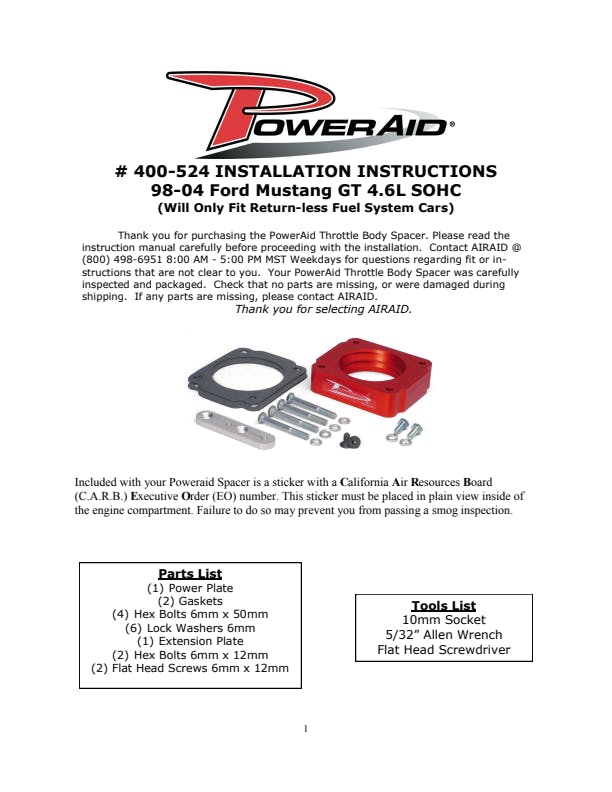 The POWERAID Throttle Body Spacer is designed to enhance mid-range torque using a patented Helix Bore which spins intake air going through the throttle body spacer. Mounting hardware included for installation.