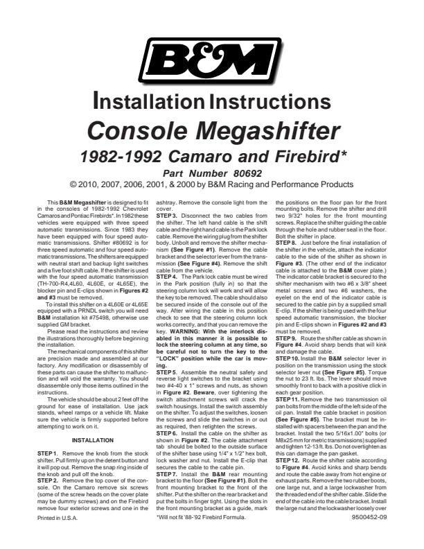 Fits 1982-1992 Chevrolet Camaro and Pontiac Firebird. Does not fit 1988-92 Firebird Formula model. Compatible with GM TH400, 350, 200, 700R4/4L60, 4L60E, 4L65E, 4L80E transmissions w/o PRNDL switch. For 4L60E through 4L85E trans with PRNDL switch, use optional kit# 70499