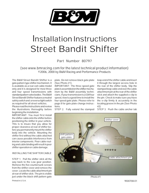 With its cutting-edge design combined with race-proven mechanics, the Street Bandit offers an unbeatable combination of performance, functionality, and looks! This high-performance street-oriented shifter comes set up for 3-speed transmissions and is packed with all kinds of features. Starting out as a seven-pound block of 6061-T6 aluminum, the Pro Bandit shifter features CNC machined construction, an ergonomically shaped stainless knob with a polished & matte finish, trigger-activated reverse gate release function (does not have a reverse lockout to meet NHRA/IHRA safety rules.) The Street Bandit is compatible with forward or reverse pattern valve bodies and is fully capable of controlling 2, 3 and 4-speed automatic transmissions by simply replacing the hardened steel gate plate, and applicable brackets and levers. Other features include a 4-foot Super Duty shift cable, rear cable exit, chrome shifter bracket, back up light switch, neutral safety switch, cable brackets, and levers for most popular brands of 3-speed auto transmissions. Comes with detailed instructions for an easy installation. Optional gate plates, cable brackets, lever kits, and side grip plates both with and without 12V momentary buttons are available separately. Overall Dimensions - 10L x 1.33W x 9.93H