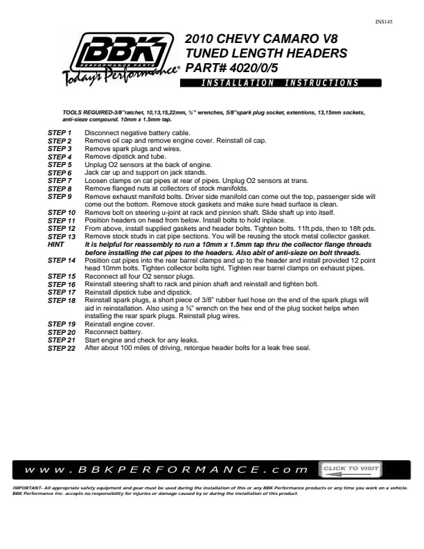 These BBK Performance shorty tuned Length exhaust Headers are designed and constructed as direct fit replacements for all GEN 5 Camaro 2010-15 LS3 and L99 applications. Each header is manufactured with 1-5/8" CNC mandrel bent tubing that offers unrestricted exhaust flow for increased horsepower and torque over factory OEM manifolds. BBK tuned Length headers offer improved scavenging waves for better combustion, which leads to improved performance and fuel economy over stock or equal Length headers. As with all BBK Performance exhaust headers they feature a 3/8" laser cut flange for additional strength and a guaranteed leak free fit. All headers are robotically and precision hand welded and then pressure tested to ensure years of reliability and performance in the real world. All BBK exhaust headers are available in a titanium ceramic or polished silver ceramic coated finish and include new exhaust header gaskets, header bolts and hardware to complete the installation.
