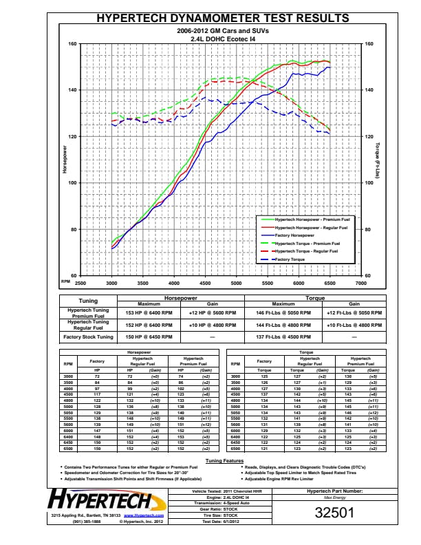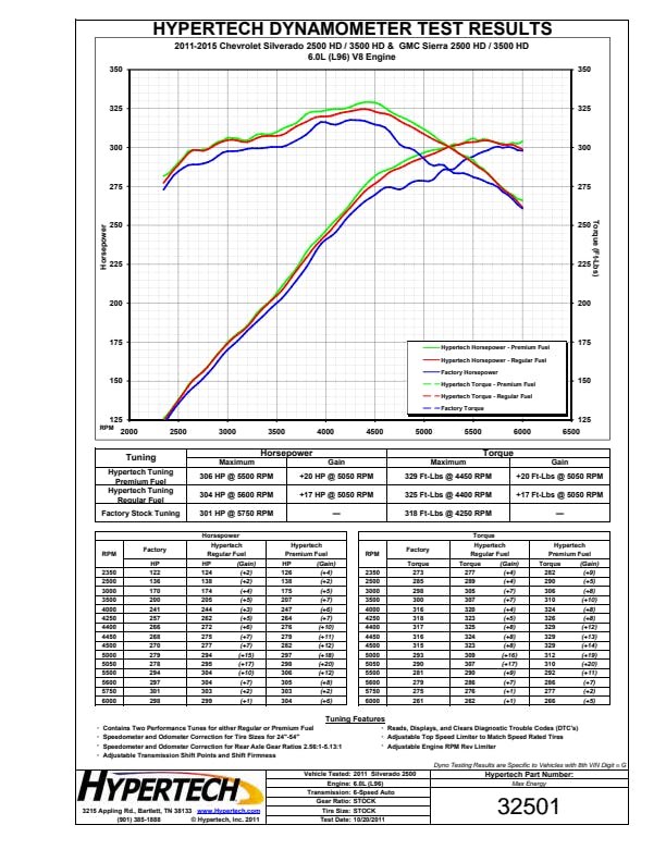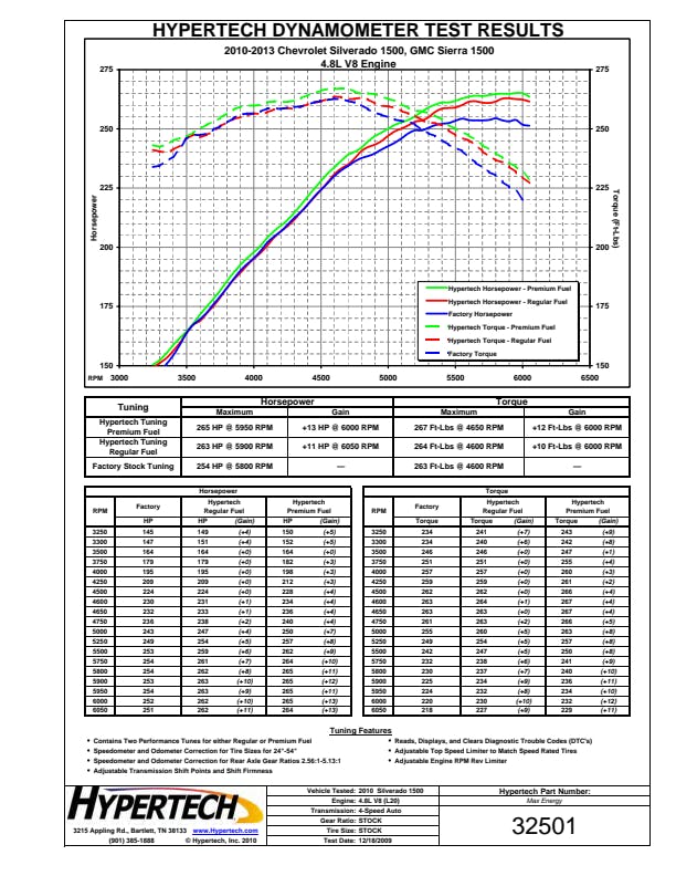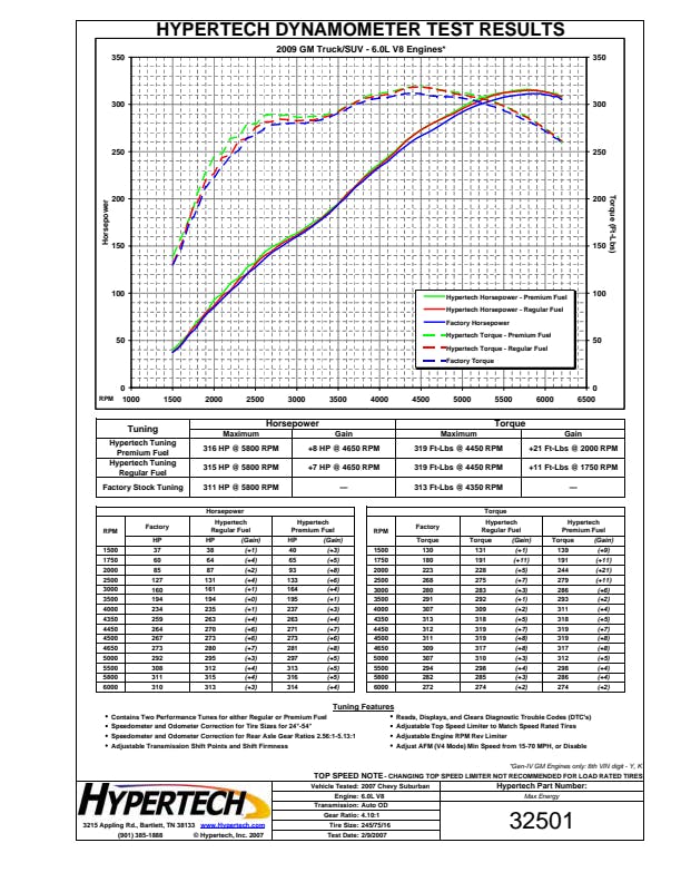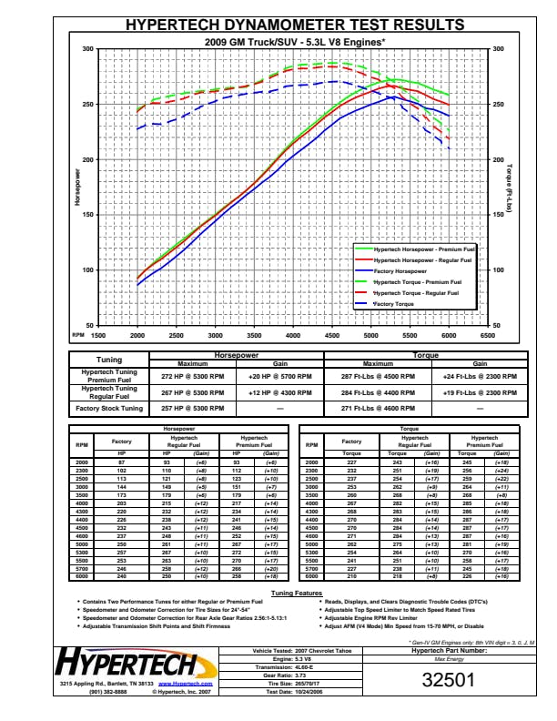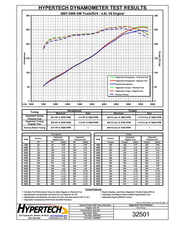 The Max Energy Power Programmer is available for select 2007.5-1996 Chrysler/Dodge/Ford/GM/Jeep/Nissan vehicles with optimized engine tuning for maximum power and performance for any kind of driving. Gas vehicles can choose from either regular or premium octane engine tuning, while diesel owners can choose from three (3) different engine tuning programs. Hypertech users are also reporting anywhere from 1-3 mpg gains as well. The Max Energy Power Programmer also has application-specific performance features including Top-Speed/Rev Limiter, Speedometer Calibrator, Automatic Transmission Shift Points/Firmness, Cooling Fan "On/Off" Temps, as well as read/display/clear DTCs. The Max Energy Power Programmer has quick & easy plug-and-play installation and is emissions certified 50-state legal (application specific).