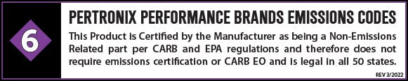 | EmissionFullDES | 6 - This Product is Certified by the Manufacturer as being a Non-Emissions Related part per CARB and EPA regulations and therefore does not require emissions certification or CARB EO and is legal in all 50 states., 6 - This Product is Certified by the Manufacturer as being a Non-Emissions Related part per CARB and EPA regulations and therefore does not require emissions certification or CARB EO and is legal in all 50 states. |